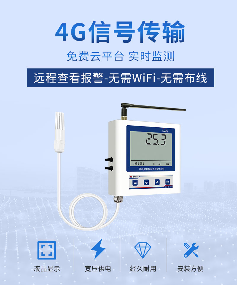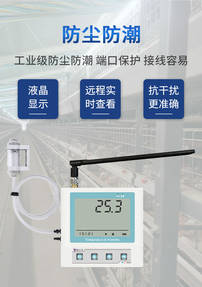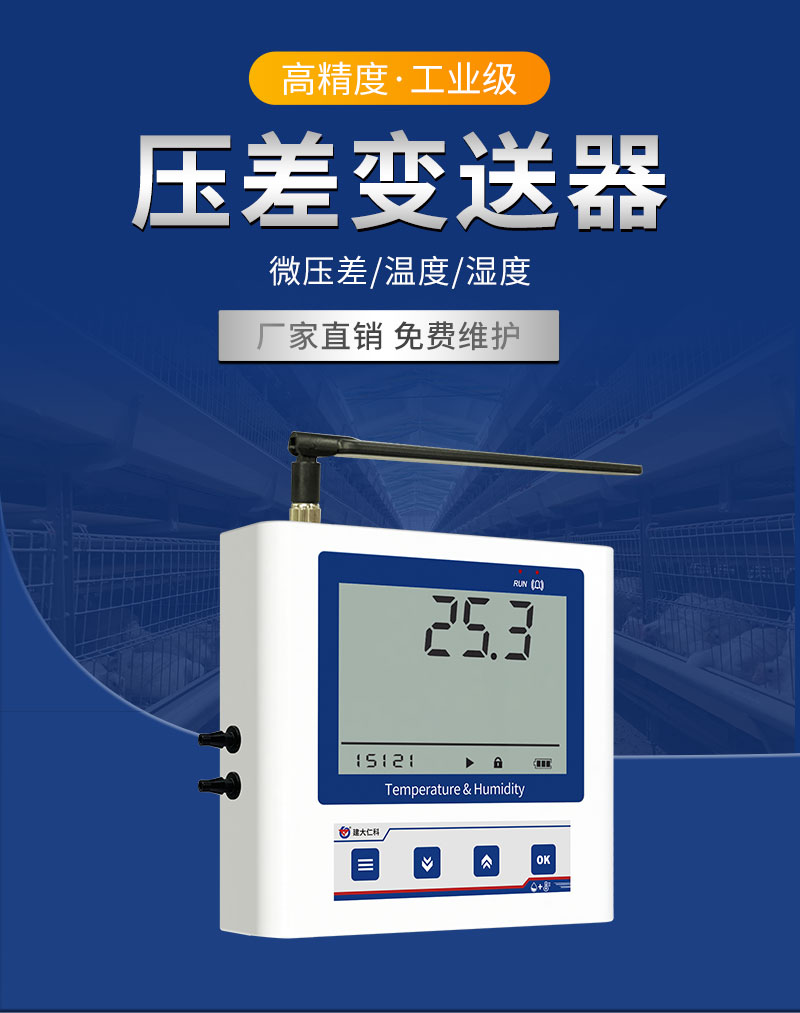 该产品是一款基于4G传输的环境检测仪,采用高精度传感器,可同时检测微压差、温度和湿度三种参数。配有大屏液晶显示,4G数据传输等功能,设备传感器具有测量精度高,抗干扰的能力强等特点,在恶劣环境下例如鸡舍中防腐蚀,保证了产品的优异测量性能。